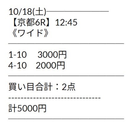 買い目点数2点で土曜日の京都6で1万500円ゲット出来ました!