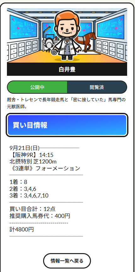 白井さんもその手の人で馬専門の獣医として第一戦で活躍していた人みたいで馬体を見てある程度予想が出来るみたいです。