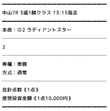 3月22日(日)の中山7Rでも単勝1点勝負で2万2000円獲得