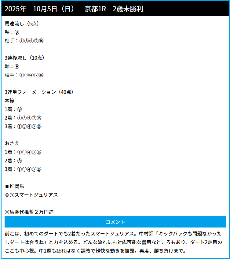 10月5日(日)のあさイチ無料予想では京都1Rで馬連・三連複・三連単の
